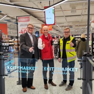 Kuvassa ovat Keskon projektipäällikkö Kari Käki, K-Citymarket Myyrmäen kauppias Aki Luomanen ja Rakennustyö Salmisen projektinjohtaja Harri Romppanen.